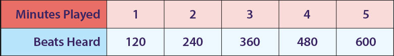 Kat and Xander produced a techno version of Ring Around the Rosie. The bass line was fantastic, and it drove the little kids wild with excitement! Here is a table showing the number of beats heard in the music per minutes played. What is the slope of this line?