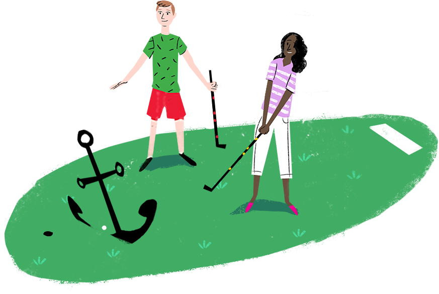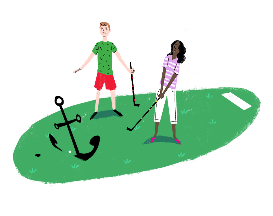 Heads up! In mini-golf, there are usually 18 “holes,” or places where each player swings a golf club to try to get a ball into a hole in the ground. Each hole is decorated with something fun, like a castle. Careful, you don’t want to swing and have your ball roll right by the hole!