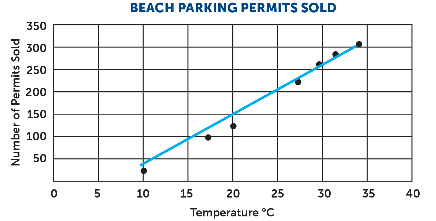 It’s Tempest’s job to draw lines of best fit on the graphs before they air on TV. She is working on a story about how temperature affects beach attendance in the summer. Which of the following would best serve as a line of best fit?